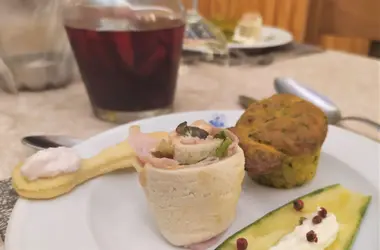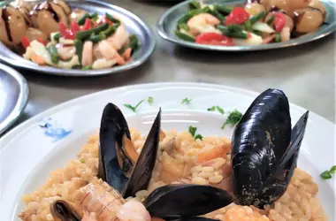 Die tägliche neue Speisekarte bietet eine reiche Vielfalt mit 4 Hauptgängen und einer Auswahl von zwei Menüs (Fleisch und Fisch) mit der Möglichkeit der Änderung der Wahl. Besonders auf die Bedürfnisse der Kinder wird geachtet.